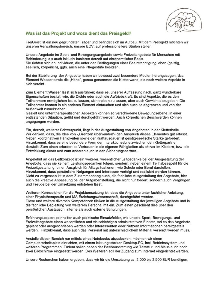 FreiGeist gUG FreiGeist steht für eine ganzheitliche Begleitung von Menschen zur individuellen Entwicklung der Seelenfähigkeiten im Zusammenhang mit ihren körperlichen Fähigkeiten. Der Zweck der Gesellschaft ist die selbstlose Unterstützung hilfebedürftiger Personen im Sinne des § 53 Nr. 1 AO und die Förderung der Jugend- und Altenhilfe, der Erziehung, der Hilfe für Behinderte und des Sports. […]