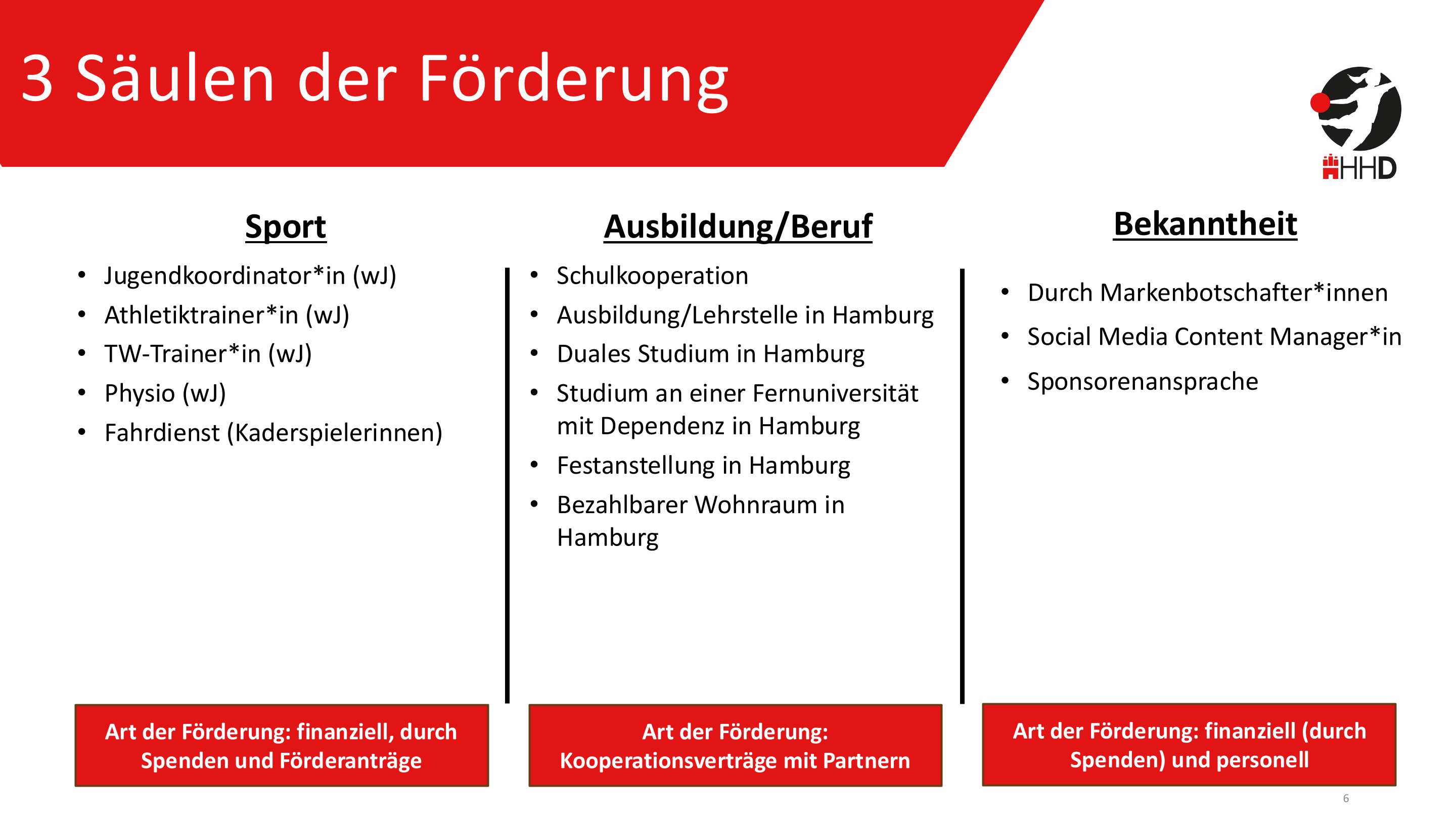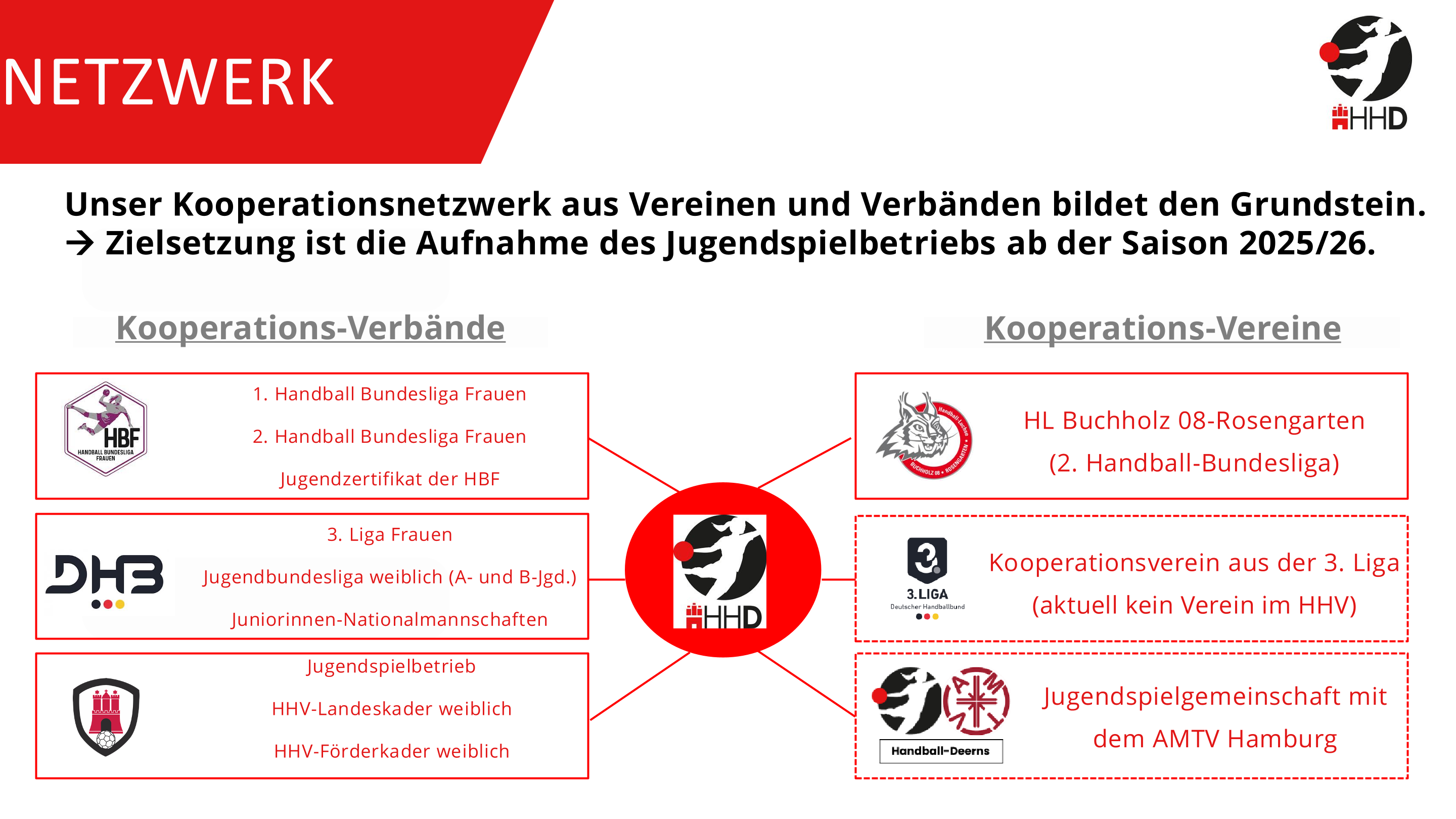 Um das Ziel, in den jeweiligen höchsten Spielklassen zu spielen, erreichen zu können, haben die HHD zum 15.07.2025 u.a. einen Jugendkoordinator mit 20 Stunden/Woche angestellt. Er wird folgende Aufgaben übernehmen: Strukturierte Nachwuchsförderung, Strategisches Nachwuchskonzept, Qualitätssteigerung im Training, Schnittstelle zwischen Verein, Eltern und Verband, Organisatorische Entlastung.