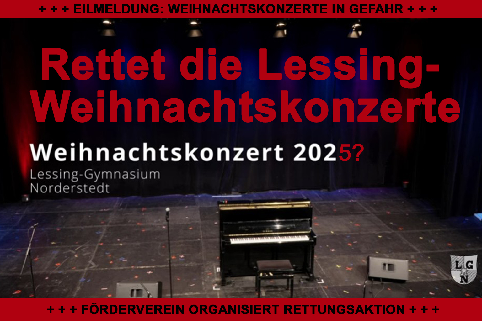 Wir sind der Förderverein des Lessing-Gymnasiums Norderstedt. Aktuell engagieren wir uns für die Rettung unserer traditionellen Weihnachtskonzerte. Diese sind der gesellschaftliche Höhepunkt des Jahres unserer großen Schulgemeinschaft und erfreut jährlich über 1.200 Besucher*innen. Aufgrund von Sparmaßnahmen der Stadt Norderstedt kann dieses Event nur stattfinden, wenn wir es als Verein schaffen, die fünfstellige (!) Raummiete für das Kulturwerk Norderstedt in der Vorweihnachtswoche für die 3 Konzertabende zu übernehmen. Das Preisgeld ermöglicht somit dieses Event stattfinden zu lassen. Unsere gesamte Schule setzt darauf, dass wir dies als Verein schaffen. Einen Eindruck dieses kulturellen Glanzstücks der Norderstedter Schullandschaft vermittelt der offizielle Videokanal unserer Schule. Einfach mal reinklicken. Danke für die Unterstützung!